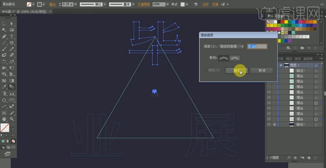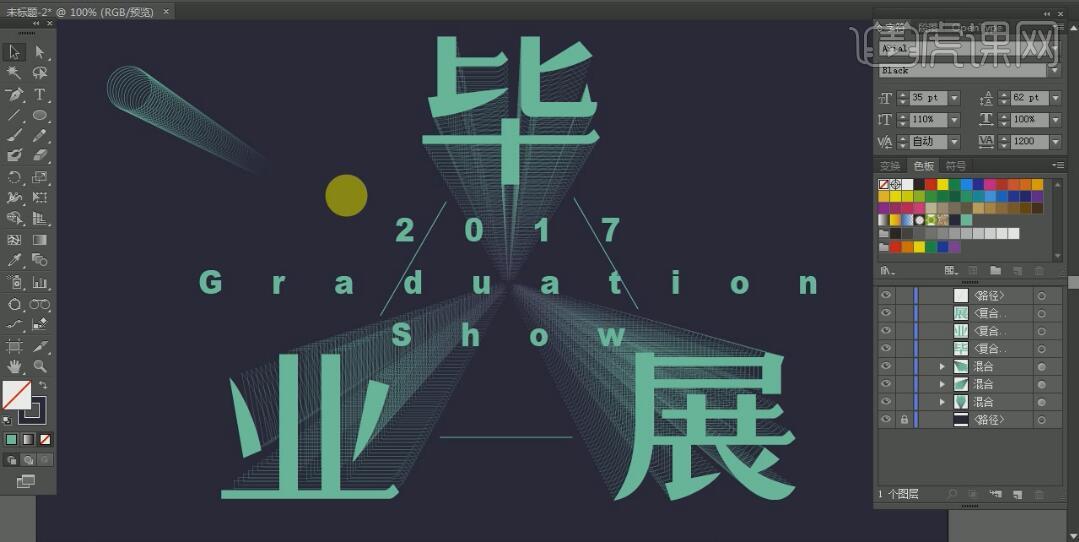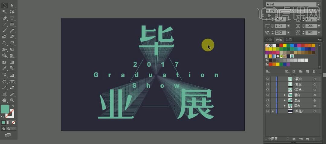 【描边】灰色,【描边】蓝绿色,【选择】毕字的两个14、【选择】圆的夹杂对象,15、顺次【选择】联系关系的图层,具体参数如图示。【填充】无,绘制合适大小的正圆,按Alt键【挪动复制】圆,按Alt键【挪动复制】至合适的数量, 【选择】两个圆,按【Ctrl+Alt+B】成立夹杂结果。【颜色】蓝绿色,10、【选择】文字的夹杂结果对象,利用【文字东西】,【填充】无,【填充】无,按【Ctrl+B】原位后置粘贴。 。