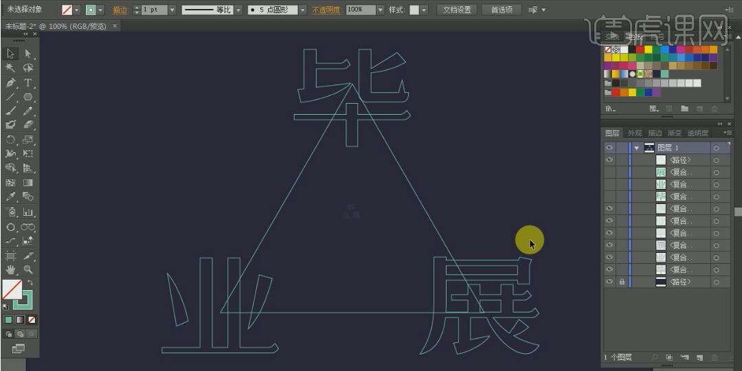 【描边】灰色,【描边】蓝绿色,【选择】毕字的两个14、【选择】圆的夹杂对象,15、顺次【选择】联系关系的图层,具体参数如图示。【填充】无,绘制合适大小的正圆,按Alt键【挪动复制】圆,按Alt键【挪动复制】至合适的数量,